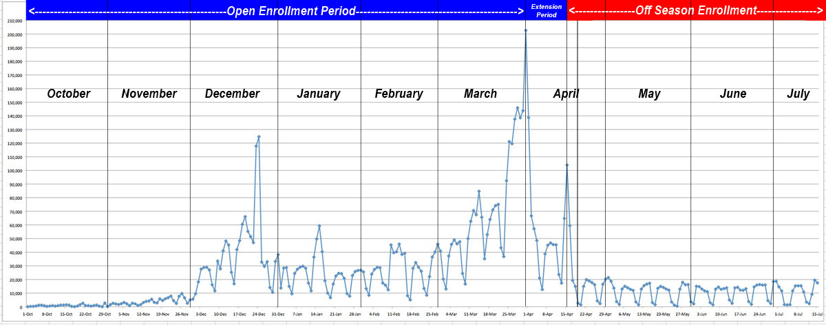 • The massive spike in late March, culminating in a nearly off-the-chart peak on the "official" open enrollment deadline of March 31st, which saw over 200,000 transactions by itself