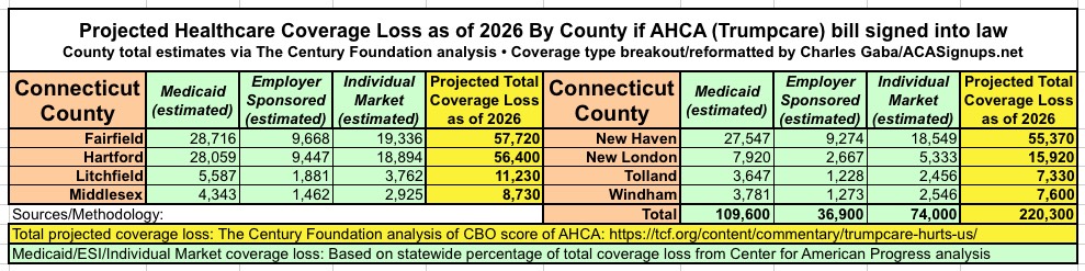 With that in mind, here's the County Level breakout of the Century Foundation's projections of how many people would lose healthcare coverage by 2026 under the GOP's AHCA bill. The yellow columns (Total) come directly from TCF's analysis; the green columns (type of coverage loss) are my own proportional estimates within those totals.