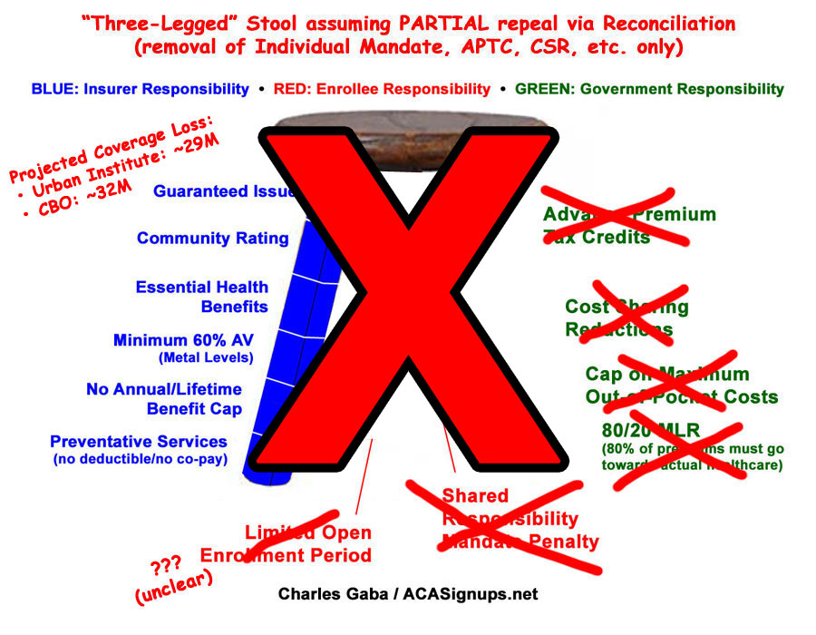 Here's what it actually looks like for a variety of reasons, including both legitimate glitches in the ACA itself as well as a whole lot of flat-out sabotage by the GOP over the past 7 years. While there are plenty of other issues which need to be addressed, the most obvious ones are that the tax credits need to be beefed up and applied to enrollees over the 400% FPL threshold, and the mandate penalty should really be increased. In short, two legs of the stool need to be lengthened...to continue the metaphor, we need a couple of shims. Around $12 billion per year or so should do the trick on the tax credit side. As it happens, one of the few useful parts of most of the GOP plans is that they do include a good $120 billion or so in "reinsurance/stabilization" funding over 10 years...which, in practice, would amount to about the same thing. The key is that this funding would have to be added to the existing ACA funding, not replacing it, which is what these plans do instead: