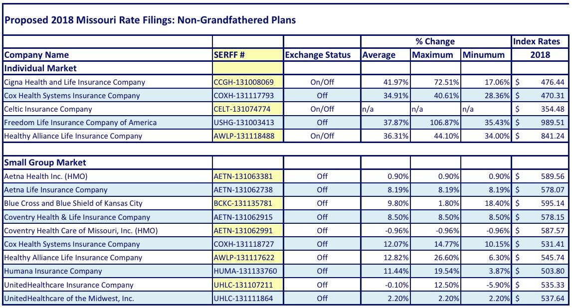 Normally I'd be pretty irritated by this, but to be honest, given what an utter mess the 2018 individual market landscape is shaping up to be, I can kind of understand this; the situation is even more fluid/confusing than ever, so I guess they figured there wasn't much point in posting the rate requests earlier than necessary if they're likely to change a dozen times before being locked in anyway. In any event, today the Missouri insurance department finally posted MO's requested rate changes for next year. This is kind of a big deal for the Show Me state, because until now, they were the only state in the country which didn't allow their own insurance commissioner to review rate hike requests.