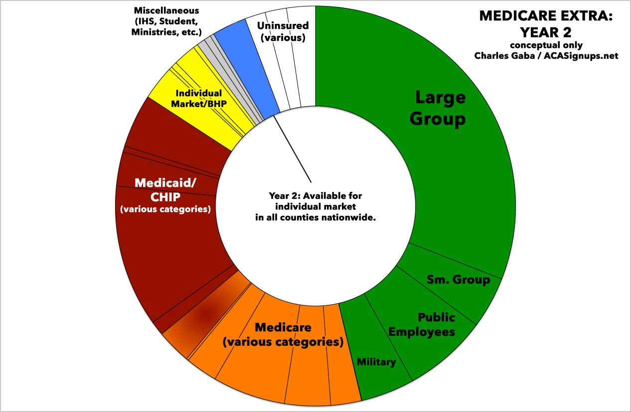In Year 6, enrollees in Medicaid and CHIP would be auto-enrolled into Medicare Extra. In Year 8, large employers would have the option to sponsor Medicare Extra for all employees, and the tax benefit for employer-sponsored insurance would be limited for high-income employees.