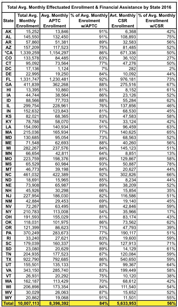 The primary sources for the 2016 average monthly effectuated enrollment are payment and enrollment data. These data represent the average monthly number of unique individuals who had an active policy in 2016 and who had paid their premium (thus becoming effectuated) as of March 15, 2017. This was calculated by total member months divided by 12. Data include effectuation from both Federal and State-Based Exchanges.
