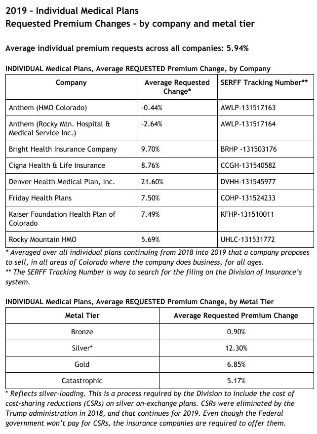 The same seven companies that offered on-exchange, individual plans are returning for 2019 - Anthem (as HMO Colorado), Bright Health, Cigna Health and Life, Denver Health Medical Plans, Friday Health Plans, Kaiser Foundation Health Plan of Colorado and Rocky Mountain HMO. And like in past years, this means that all counties in Colorado will have at least one on-exchange company selling individual health plans.“I’m very pleased to see that we kept the same seven companies selling on-exchange plans,” said Interim Insurance Commissioner Michael Conway. “Last year we worked hard to keep them in Colorado and I think that work is reflected in their decisions for 2019.”