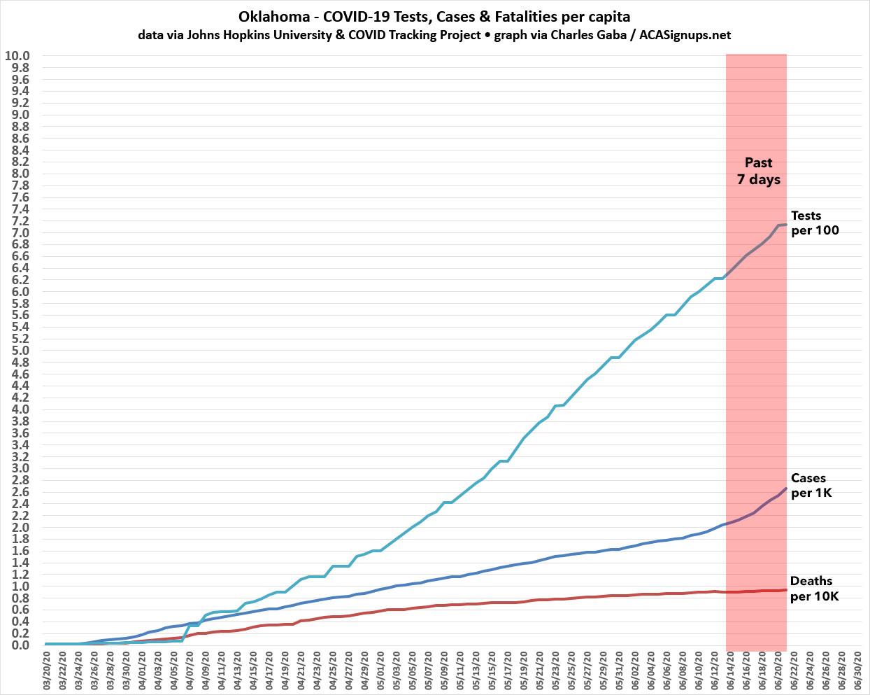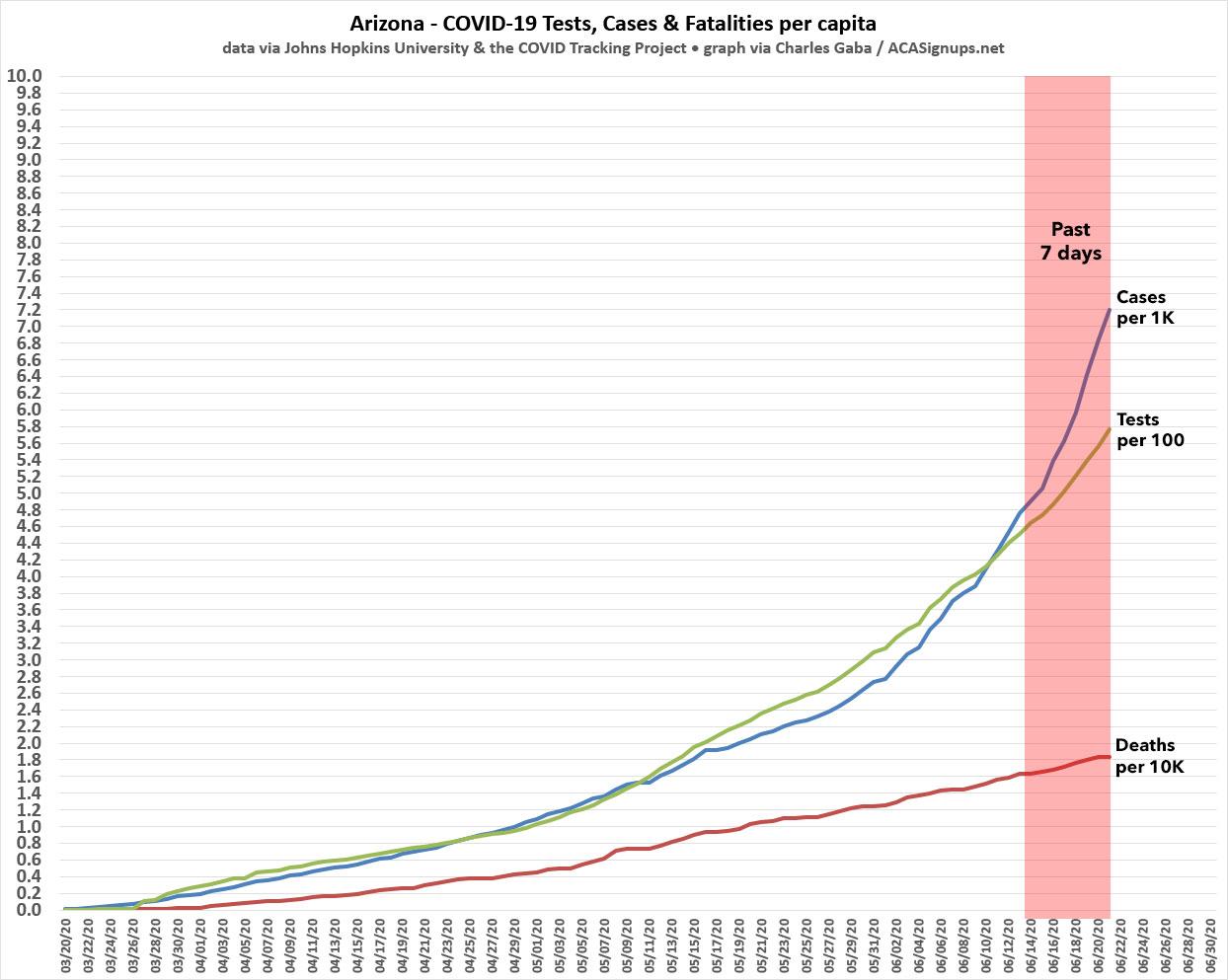 In Texas, Oklahoma and South Carolina, the two past-week trendlines aren't that far apart; the bulk of the new cases (but not all) are likely due to testing ramping up. In Florida, however, new cases are clearly starting to outpace the testing, and in Arizona, yikes.