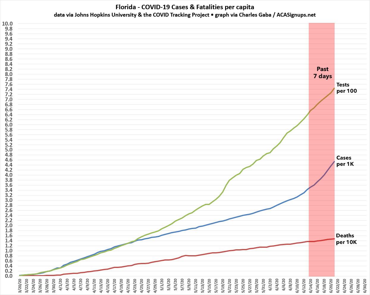 The big story re. the coronavirus pandemic the past week or two is how it's shifting from the mostly northeastern states ravaged by it from March - May to now hitting the sunbelt, south and southwestern states in June (and likely July). With that in mind, here's graphs showing the cumulative per capita increase in positive COVID-19 cases and fatalities over time in the 5 states with the highest cases (all of which happen to be Dem-controlled, w/the exception of Massachusetts having a Republican governor) vs. the 5 states with the highest percent increase in cases over the past week (all of which happen to be GOP-controlled).