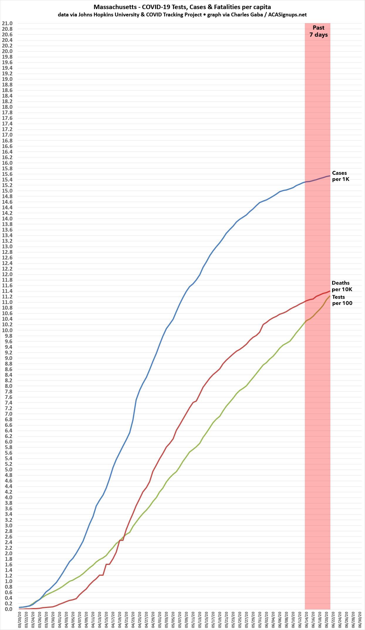 In all five cases, while new cases are still increasing at a noticeable rate, the testing has ramped up much more quickly over the past week or so than new cases have (although the ratio isn't as large as I'd hope to see in Massachusetts).