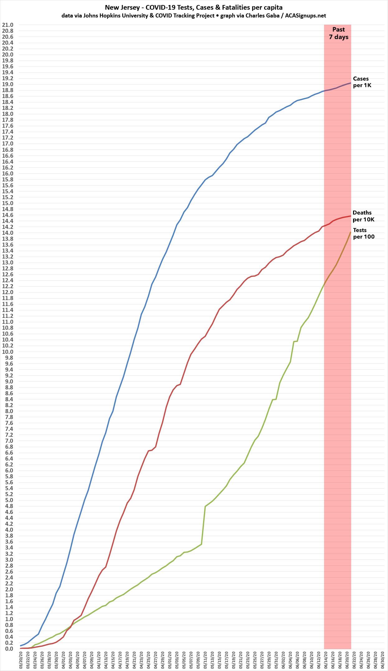 IMPORTANT: In order to make the graphs readable, I've had to use different scales for all three lines. Testing is per 100 residents. Cases is per 1,000 residents. Deaths are per 10,000 residents. If I tried to use the same scale for each, the fatality line would appear to be horizontal for most states while the testing line wouldn't even fit on the graphs. Again, it's the relative curves which matter here.