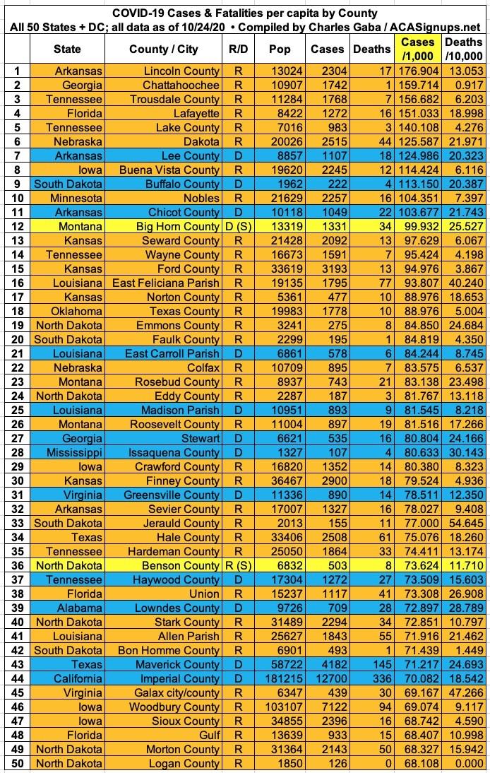 Here's the top 100 counties ranked by per capita COVID-19 fatalities as of Saturday, October 24th (click image for high-res version):