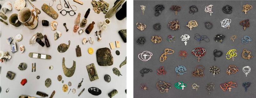 On the left: Display of personal items seized from Jewish victims as they were led to the gas chambers.
