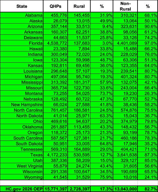 The CMS Public Use File does break out "Rural" vs. "Non-Rural" enrollment for the 30 HealthCare.Gov states...Florida has the lowest percent of rural enrollment at just 3%, while Wyoming (understandably) has the highest, at 76% of all enrollees.