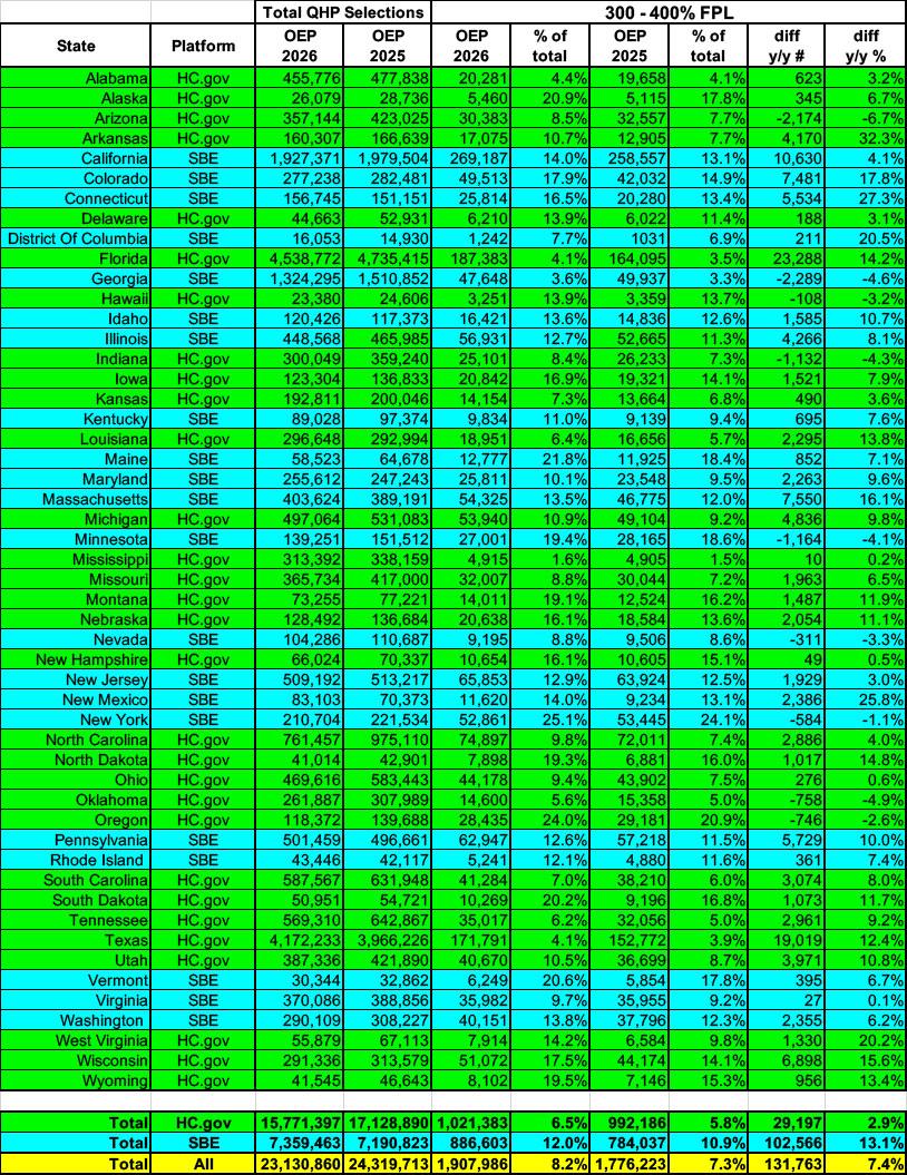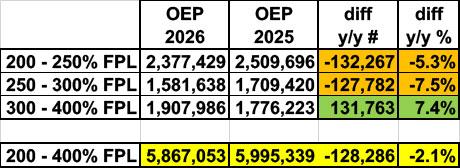 HOWEVER, if you look at the 300 - 400% FPL range, it's a completely different story: Here, enrollment actually increased by pretty much the same amount that it dropped in each of the prior two brackets: ~132,000 more enrollees, an increase of 7.4% vs last year!