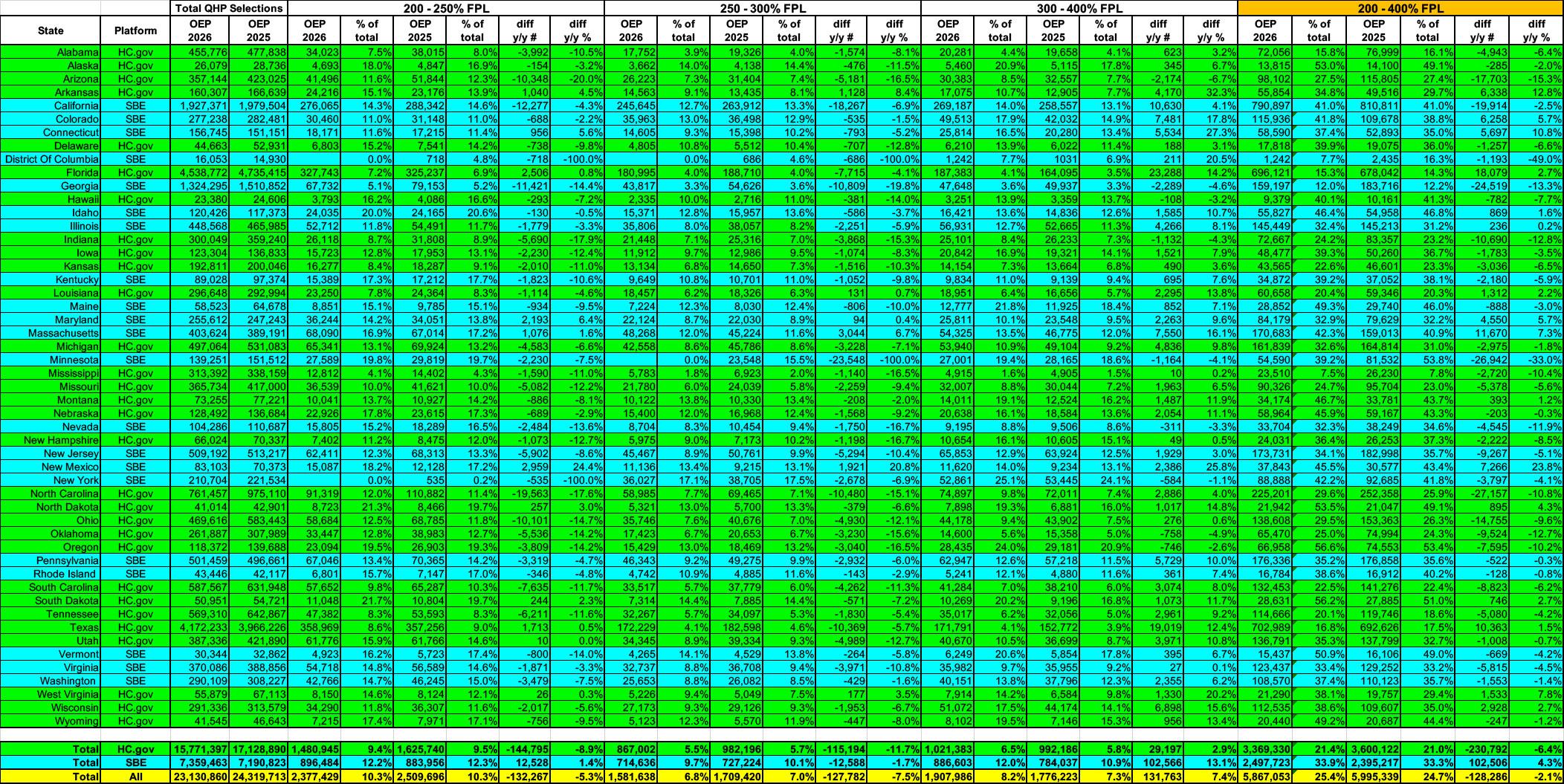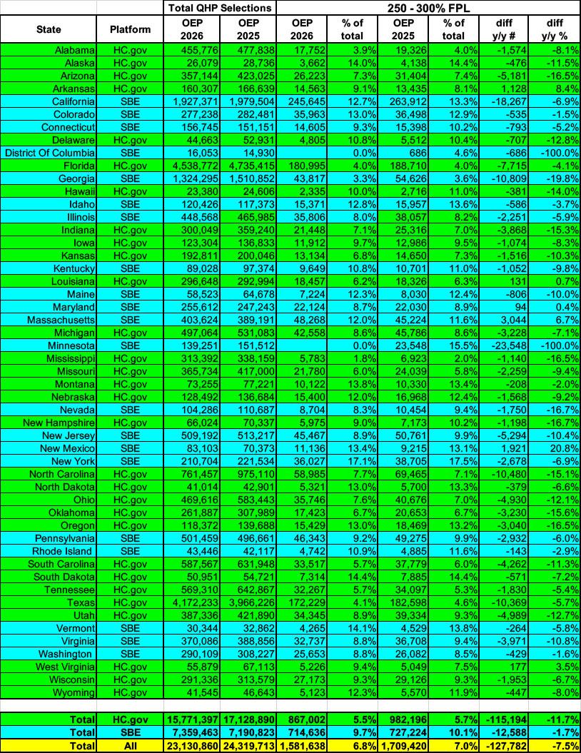 This is almost certainly what explains the sudden surge in households projecting a 300 - 400% FPL income range in 2026. It doesn't mean that all of them will end up being successful, mind you; many of them will likely end up over the 400% FPL threshold after all, in which case they'll have to pay back ALL of the federal subsidies they receive this year when they file their 2026 taxes next spring (ouch).