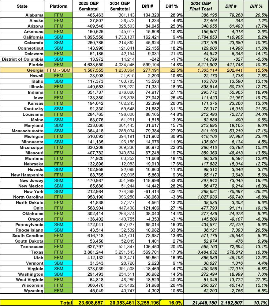 It's important to remember that Georgia moved from the federal exchange to its own state-based marketplace this year, which is why ~1.2 million enrollees have been subtracted from the 2024 HC.gov total. Note that the HC.gov numbers are rounded off to the nearest 100K, per CMS's press releases both years.