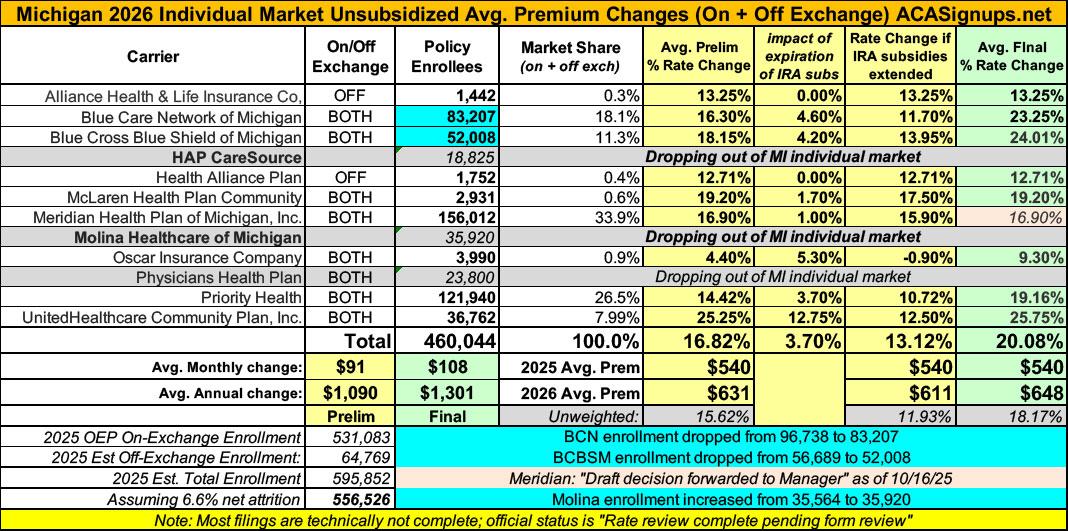 Just a few days ago I reported that the final, approved 2026 individual market rate filings in Michigan have been published to the SERFF database, for an overall weighted average rate increase of 20.1% marketwide: