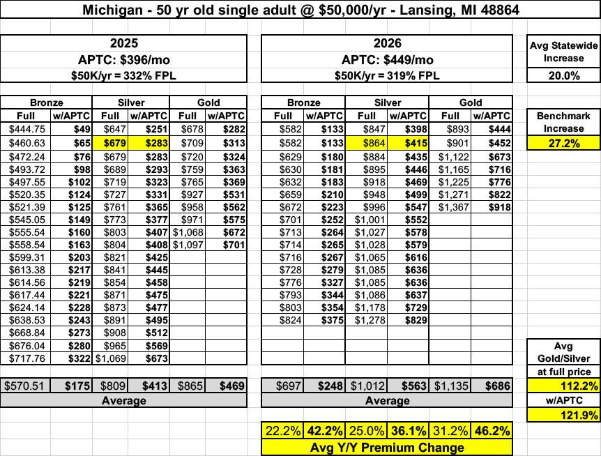For instance, in my home state of Michigan, the average benchmark Silver plan costs $404/mo this year, while the lowest-cost Gold plan averages slightly higher at $415/mo. For 2026, these are both going up significantly: The benchmark will be $523 while the lowest Gold will be $561. Since Michigan is not, unfortunately, among the states which has implemented PA, this makes sense.