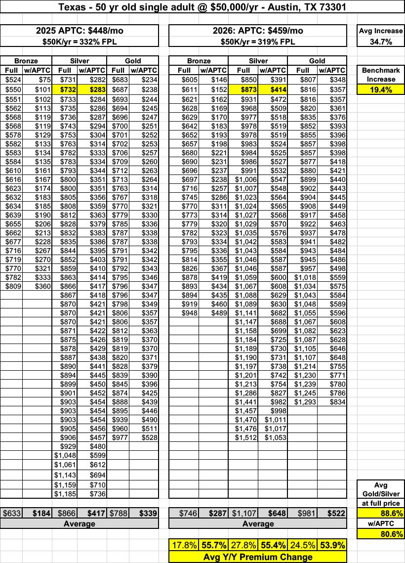 TO BE CLEAR: Premium Alignment is NOT a substitute or replacement for making the enhanced ACA tax credits permanent. It does little to help most folks earning less than 200% FPL or over 400% FPL if they're allowed to expire...and even for those between 200 - 400% FPL (roughly 6 million enrollees at the moment) it's a complement to the upgraded subsidies, not a replacement for them. In states where it was already implemented before 2026, the lost tax credits will still cause net expenses to go up (as you can see in Texas).