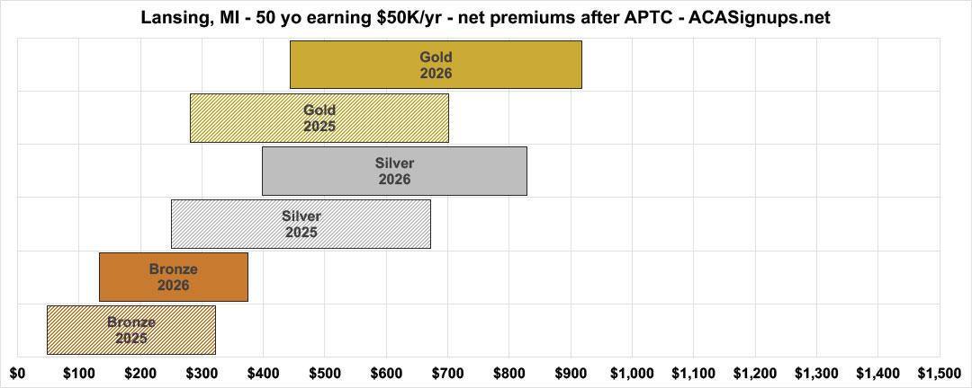 Here's what you'd normally expect the range of Bronze, Silver and Gold plan pricing to look like, using my home state of Michigan as an example: In both 2025 and 2026, Bronze plans are priced lowest, Silver plans are priced higher, and Gold plans cost the most. Makes sense, right?