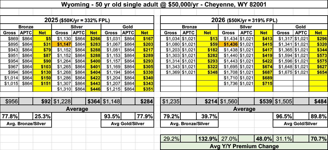 Finally, we come to the lowest-population state, Wyoming, which has had mid-level Premium Alignment in place for years now. The good news is they're continuing to do so. The bad news is that within each metal level the average net price is still shooting up significantly next year.