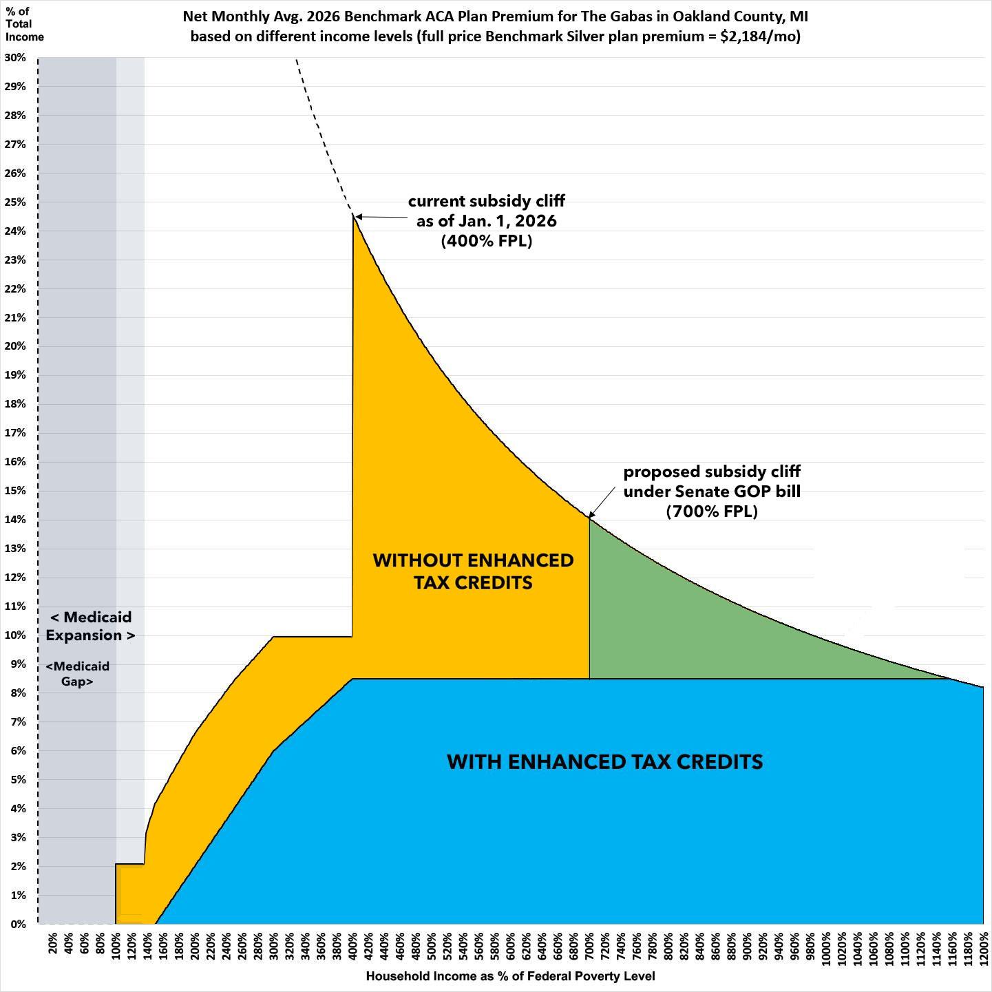 700% FPL would be barely acceptable here in Oakland County (though we'd still have to pay up to 14% of our gross income in premiums alone if we earned even $1 more than 700% FPL), but there are other parts of the country where it would still be ugly for many middle-class families.