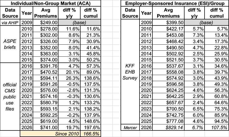 - For group coverage, I'm basing this on KFF data for single worker coverage only, not family coverage, where employers typically pay a lower percentage of premiums. I had to do it this way in order to keep it consistent with the ACA data, which is for individual covered lives.