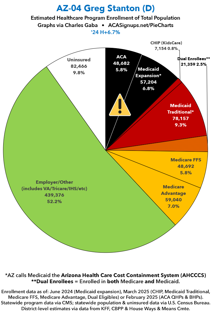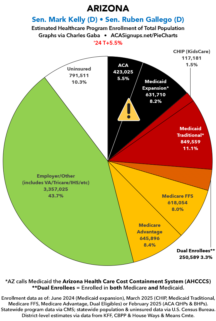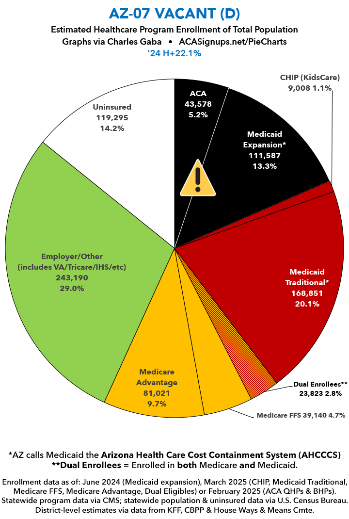 UPDATE 7/1/25: I've updated the web versions of the graphics with the most up-to-date enrollment data I have access to. The black sections w/the ⚠️ symbol are those most at risk of losing healthcare coverage due to H.R. 1, the "One Big Beautiful Bill Act" (aka the #MAGAMurderBill).