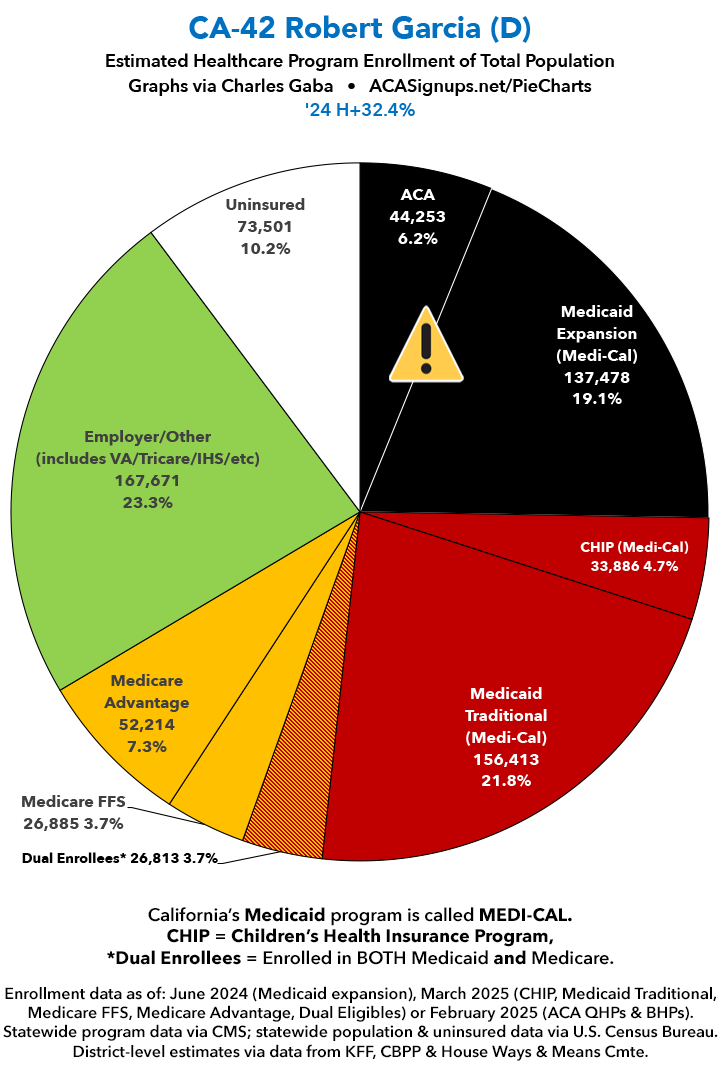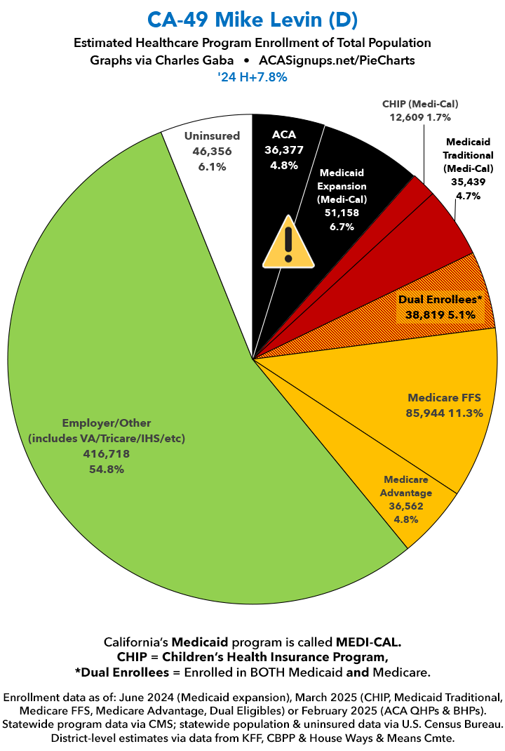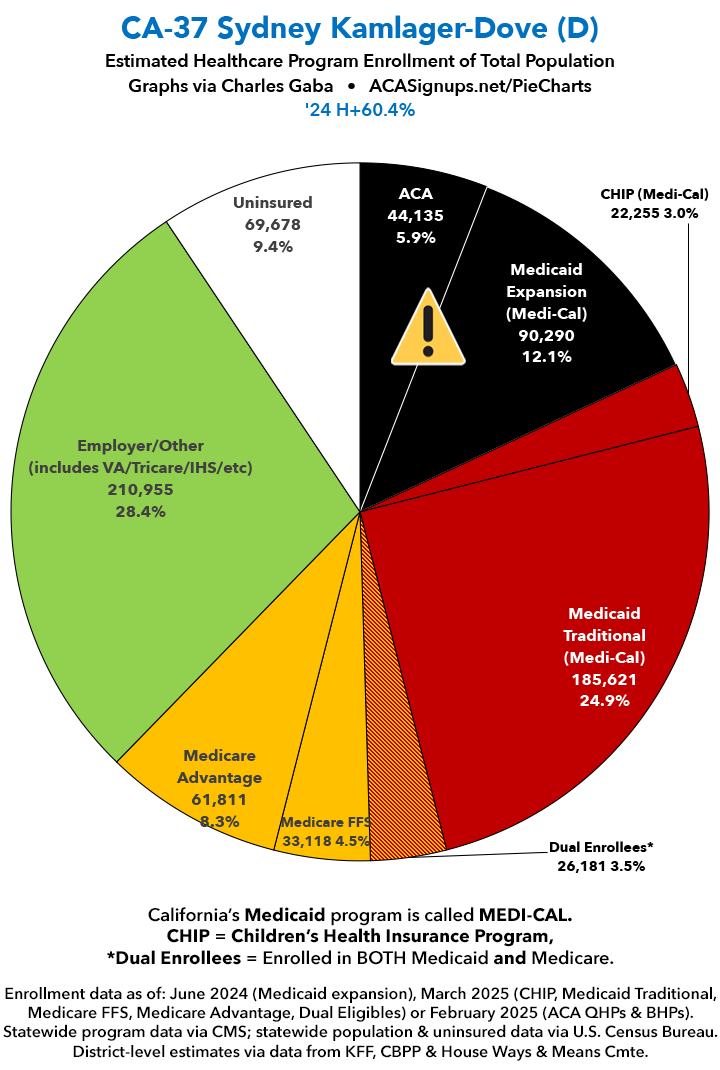 UPDATE 7/2/25: I've updated the web versions of the graphics with the most up-to-date enrollment data I have access to. The black sections w/the ⚠️ symbol are those most at risk of losing healthcare coverage due to H.R. 1, the "One Big Beautiful Bill Act" (aka the #MAGAMurderBill).