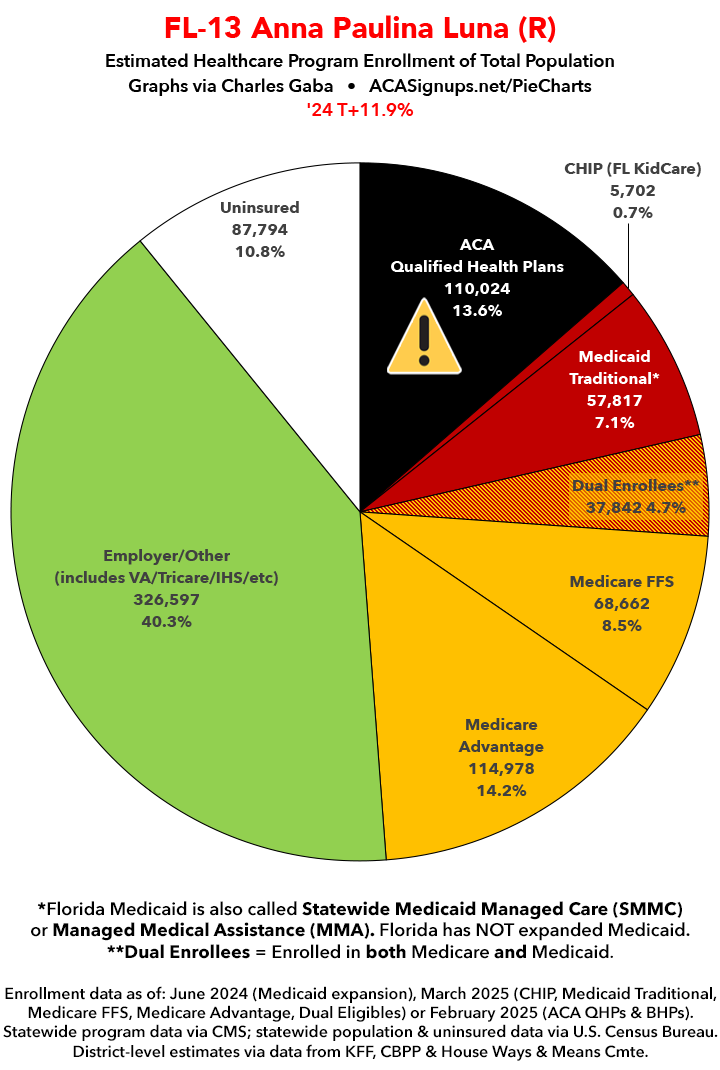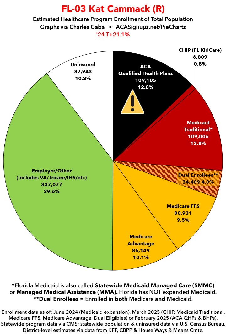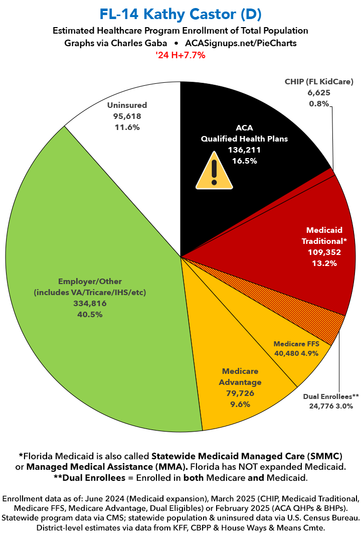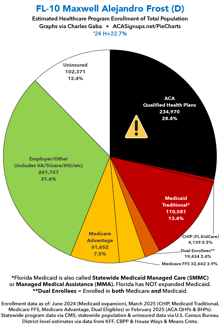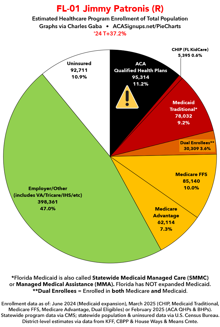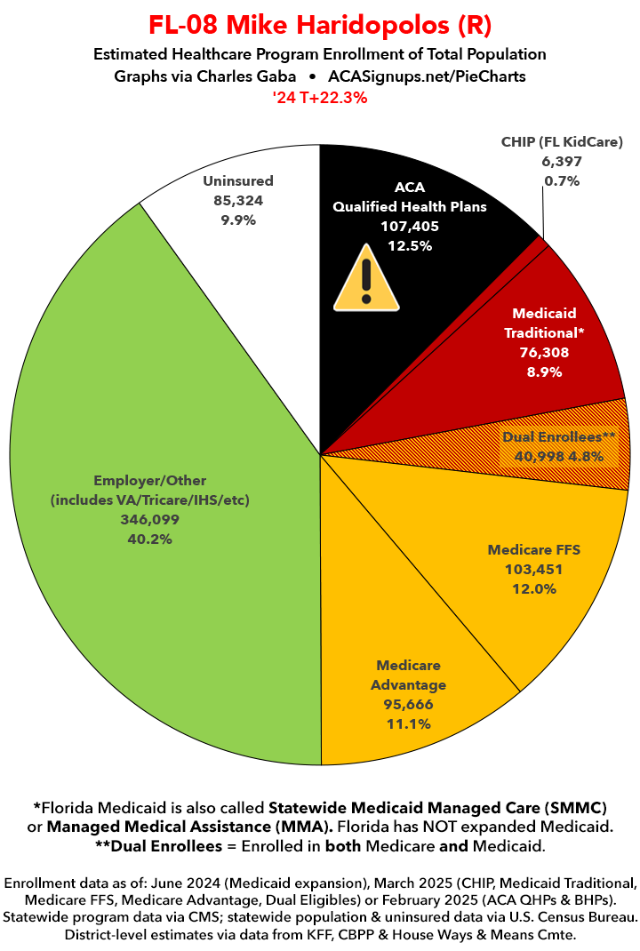 UPDATE 7/2/25: I've updated the web versions of the graphics with the most up-to-date enrollment data I have access to. The black sections w/the ⚠️ symbol are those most at risk of losing healthcare coverage due to H.R. 1, the "One Big Beautiful Bill Act" (aka the #MAGAMurderBill).