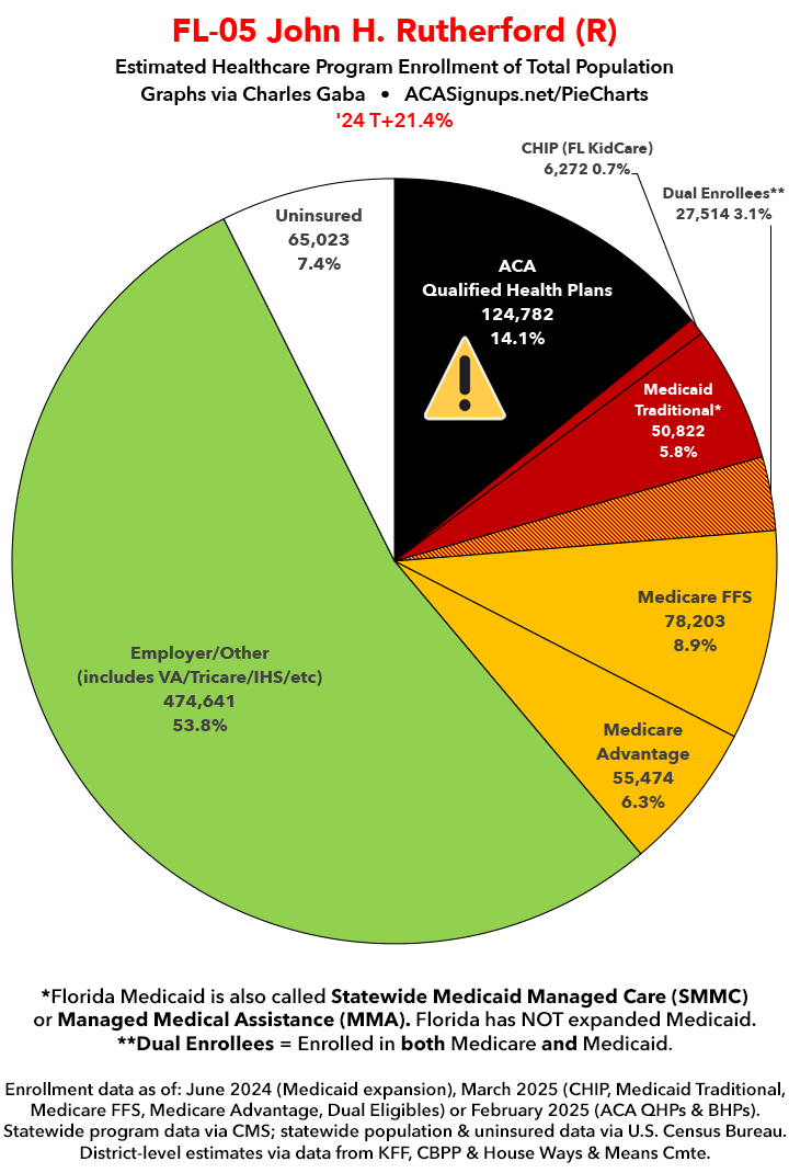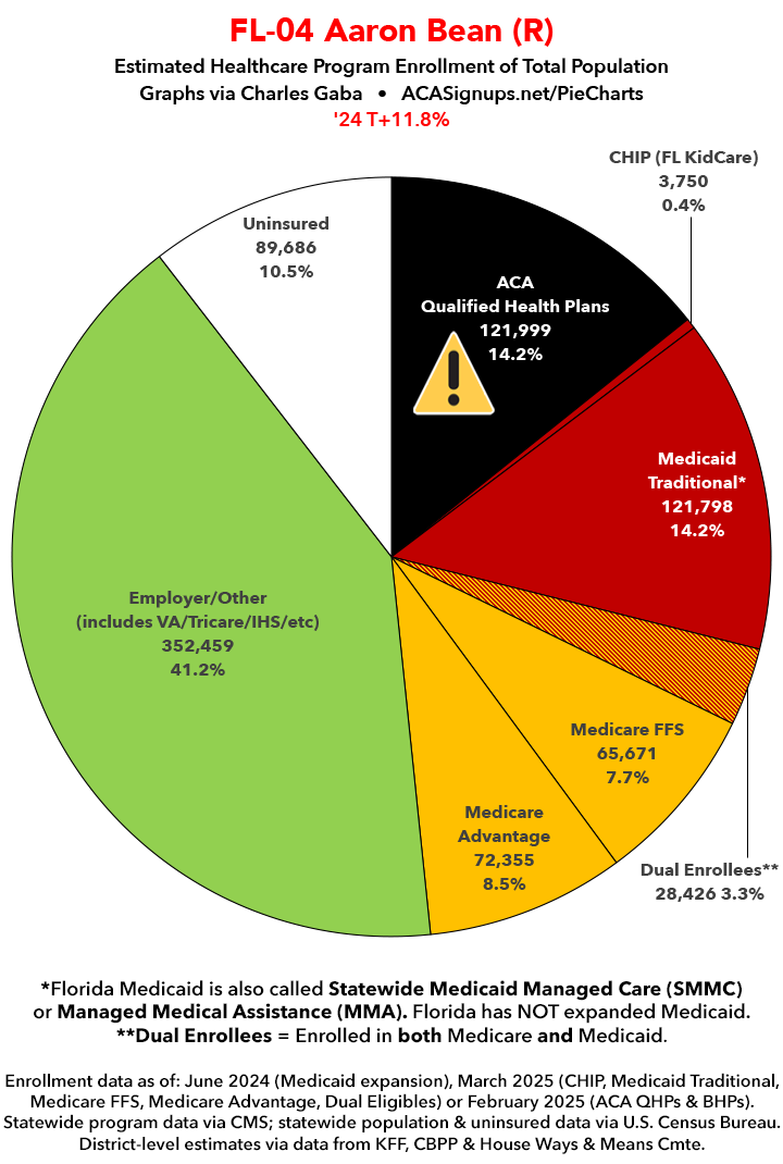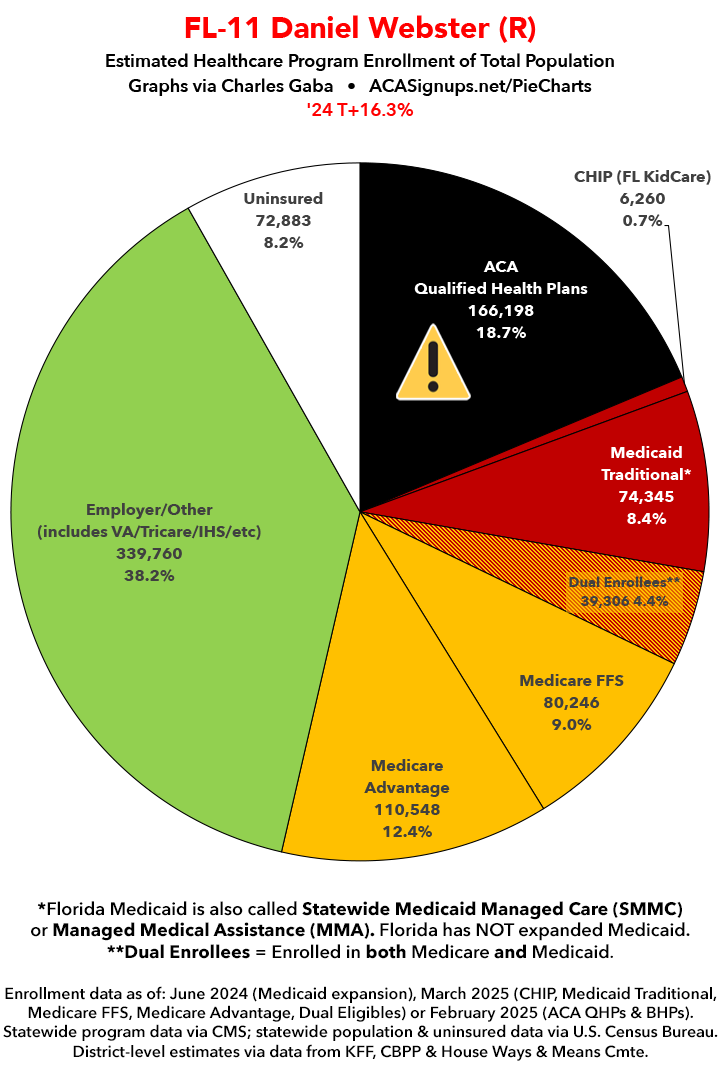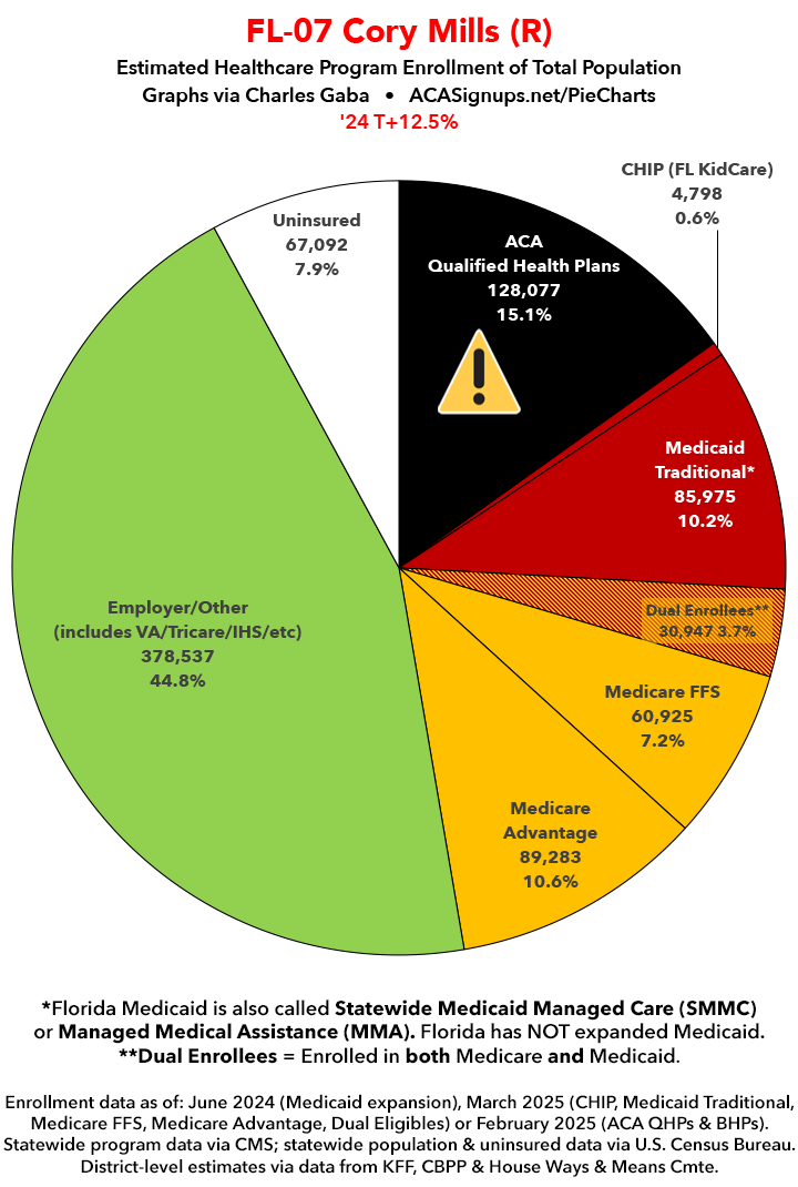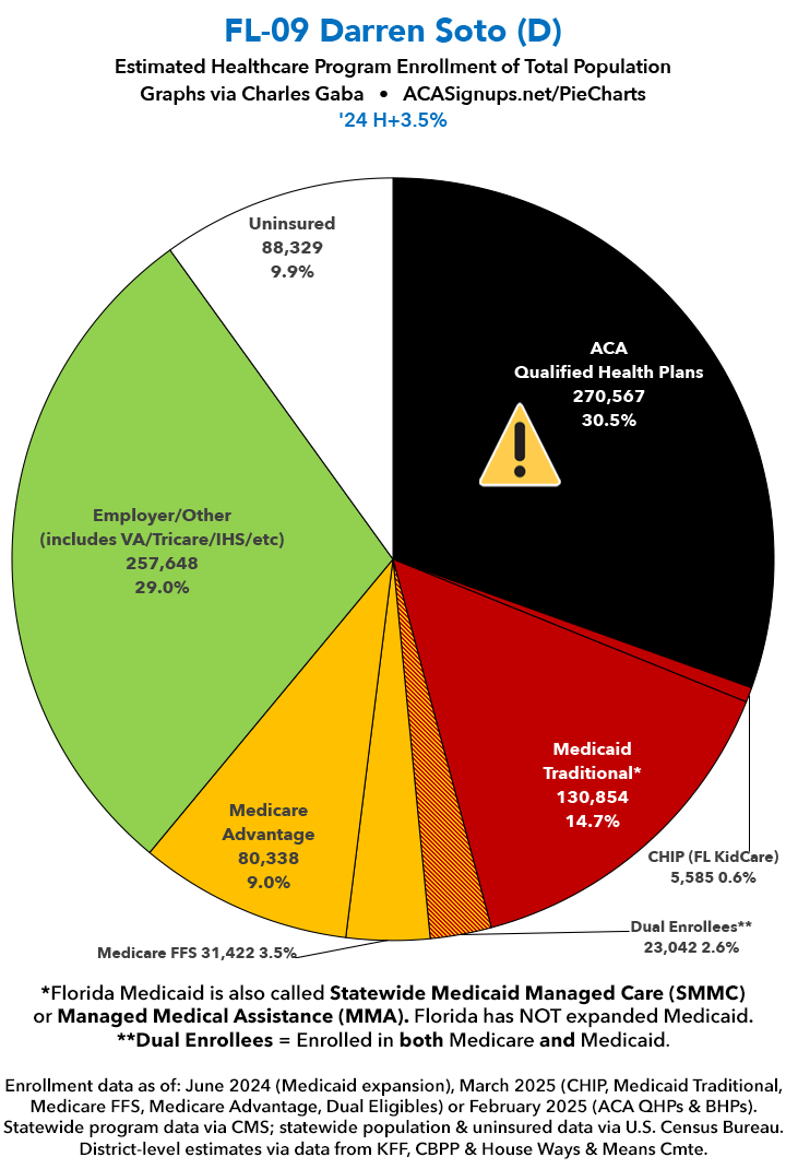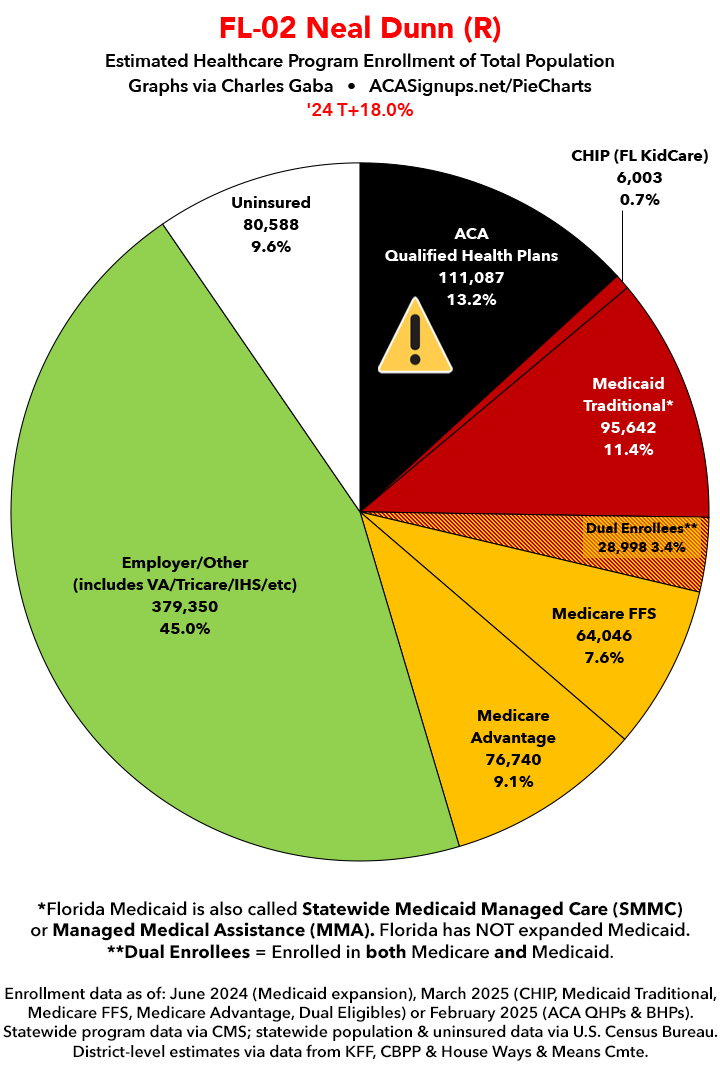 UPDATE 7/2/25: I've updated the web versions of the graphics with the most up-to-date enrollment data I have access to. The black sections w/the ⚠️ symbol are those most at risk of losing healthcare coverage due to H.R. 1, the "One Big Beautiful Bill Act" (aka the #MAGAMurderBill).