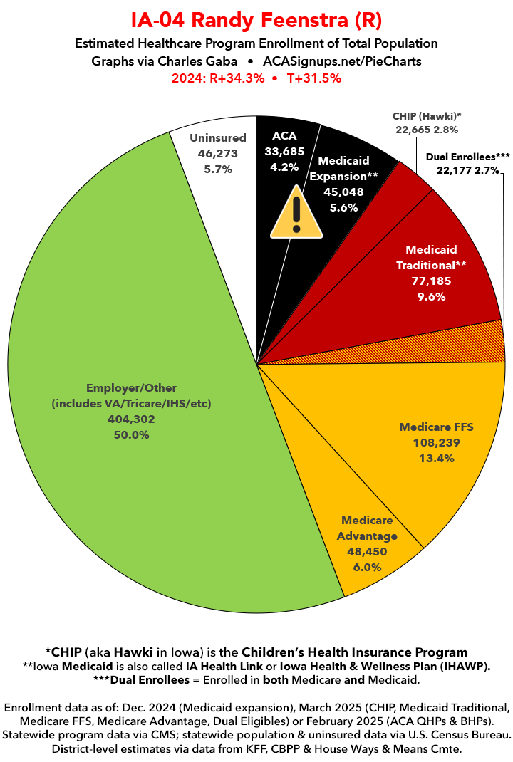 UPDATE 7/4/25: I've updated the web versions of the graphics with the most up-to-date enrollment data I have access to. The black sections w/the ⚠️ symbol are those most at risk of losing healthcare coverage due to H.R. 1, the "One Big Beautiful Bill Act" (aka the #MAGAMurderBill).