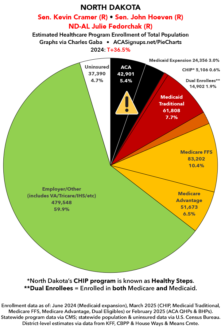 UPDATE 7/9/25: I've updated the web versions of the graphics with the most up-to-date enrollment data I have access to. The black sections w/the ⚠️ symbol are those most at risk of losing healthcare coverage due to H.R. 1, the "One Big Beautiful Bill Act" (aka the #MAGAMurderBill).