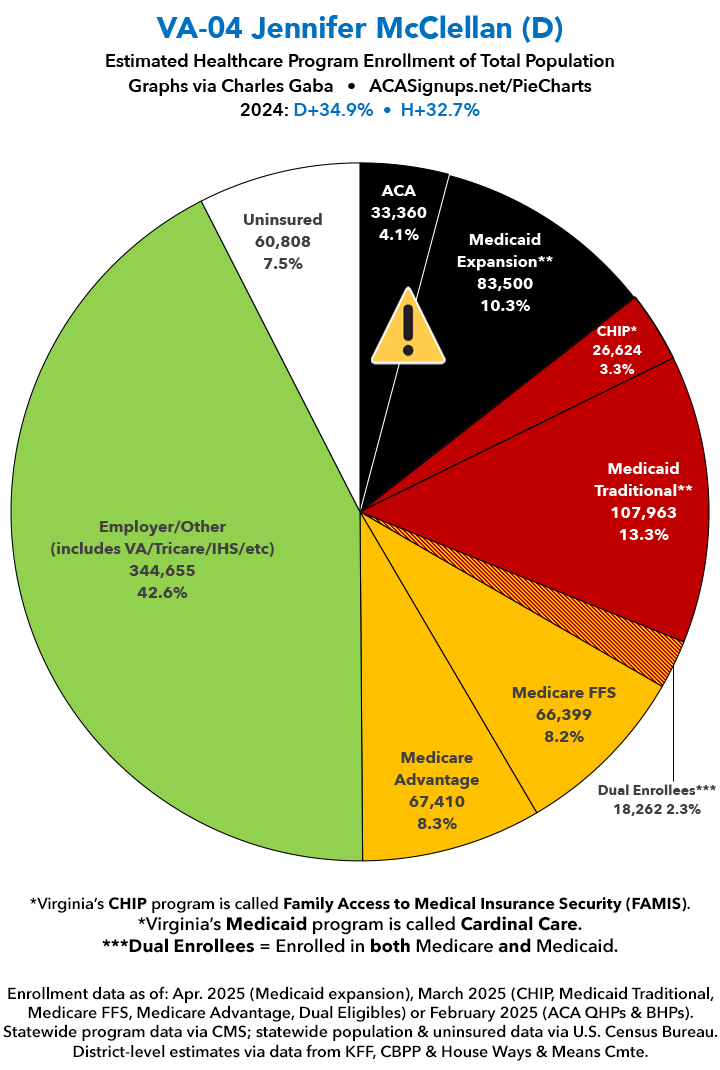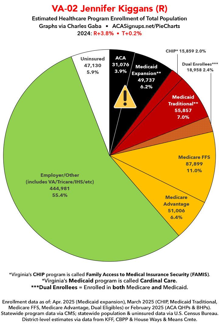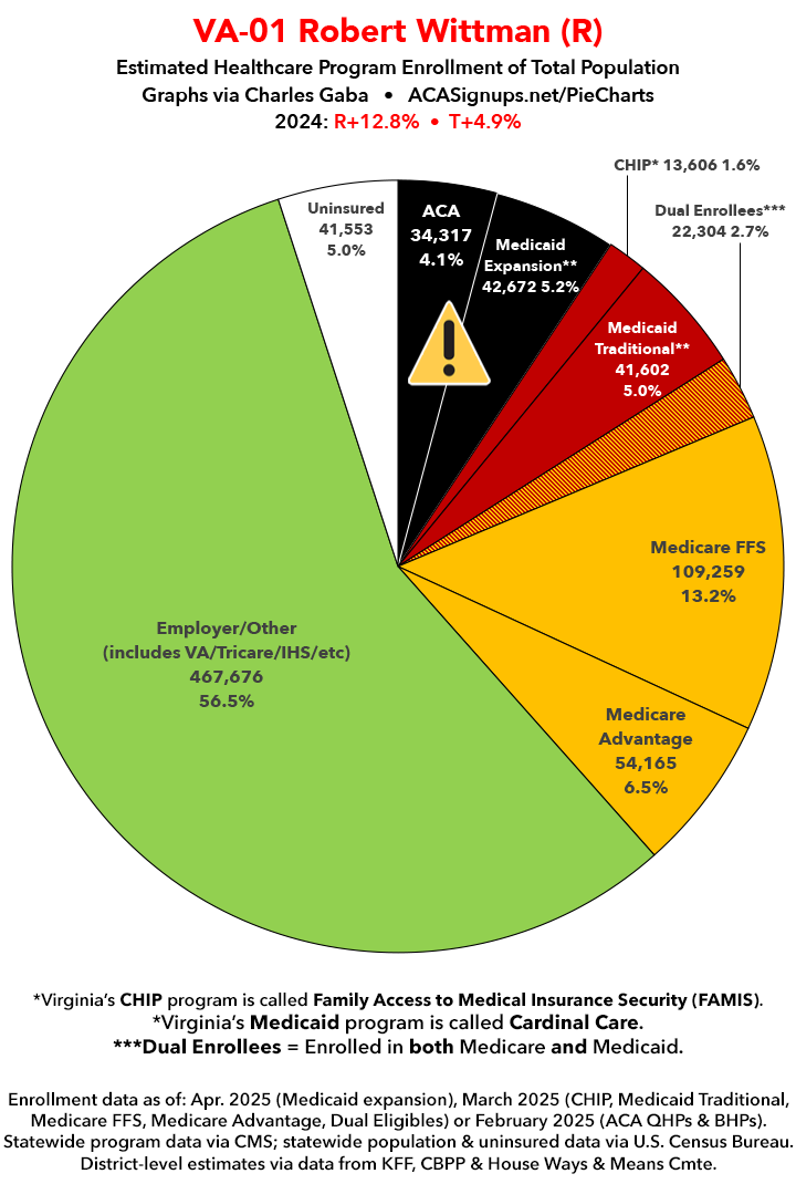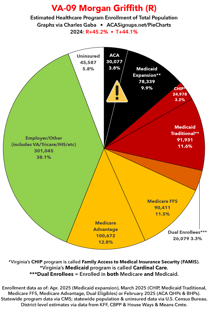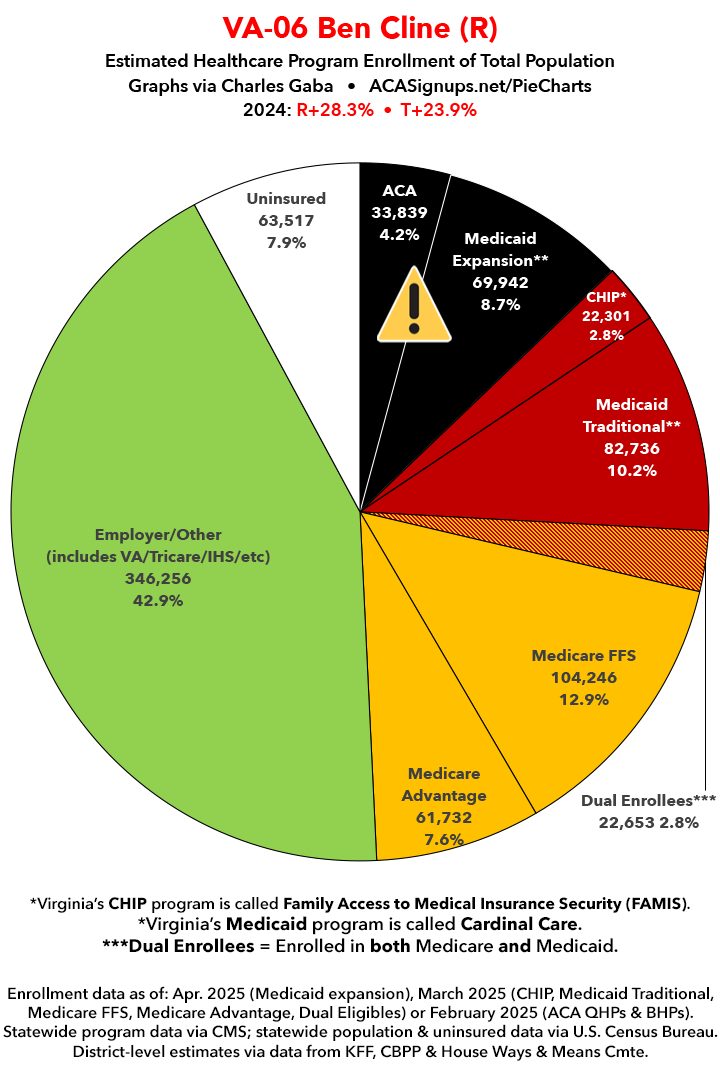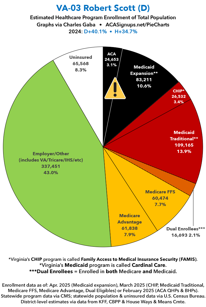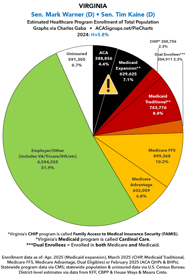 UPDATE 7/15/25: I've updated the web versions of the graphics with the most up-to-date enrollment data I have access to. The black sections w/the ⚠️ symbol are those most at risk of losing healthcare coverage due to H.R. 1, the "One Big Beautiful Bill Act" (aka the #MAGAMurderBill).​​​​​