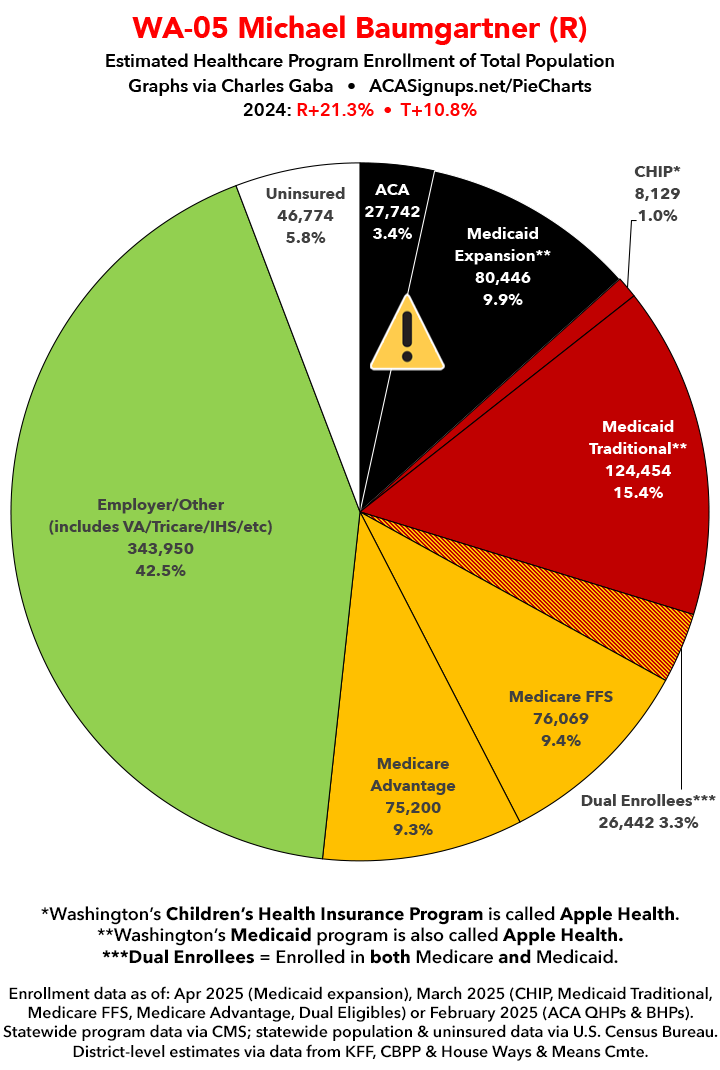 UPDATE 7/15/25: I've updated the web versions of the graphics with the most up-to-date enrollment data I have access to. The black sections w/the ⚠️ symbol are those most at risk of losing healthcare coverage due to H.R. 1, the "One Big Beautiful Bill Act" (aka the #MAGAMurderBill).