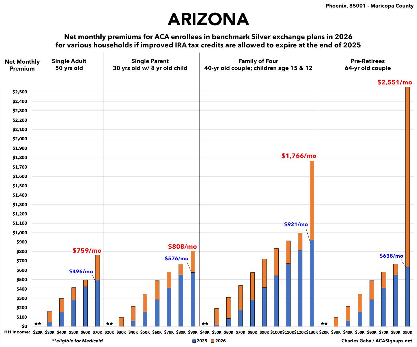 Arizona has around 423,000 residents enrolled in ACA exchange plans, 88% of whom are currently subsidized. I estimate they also have perhaps another ~8,000 unsubsidized off-exchange enrollees.