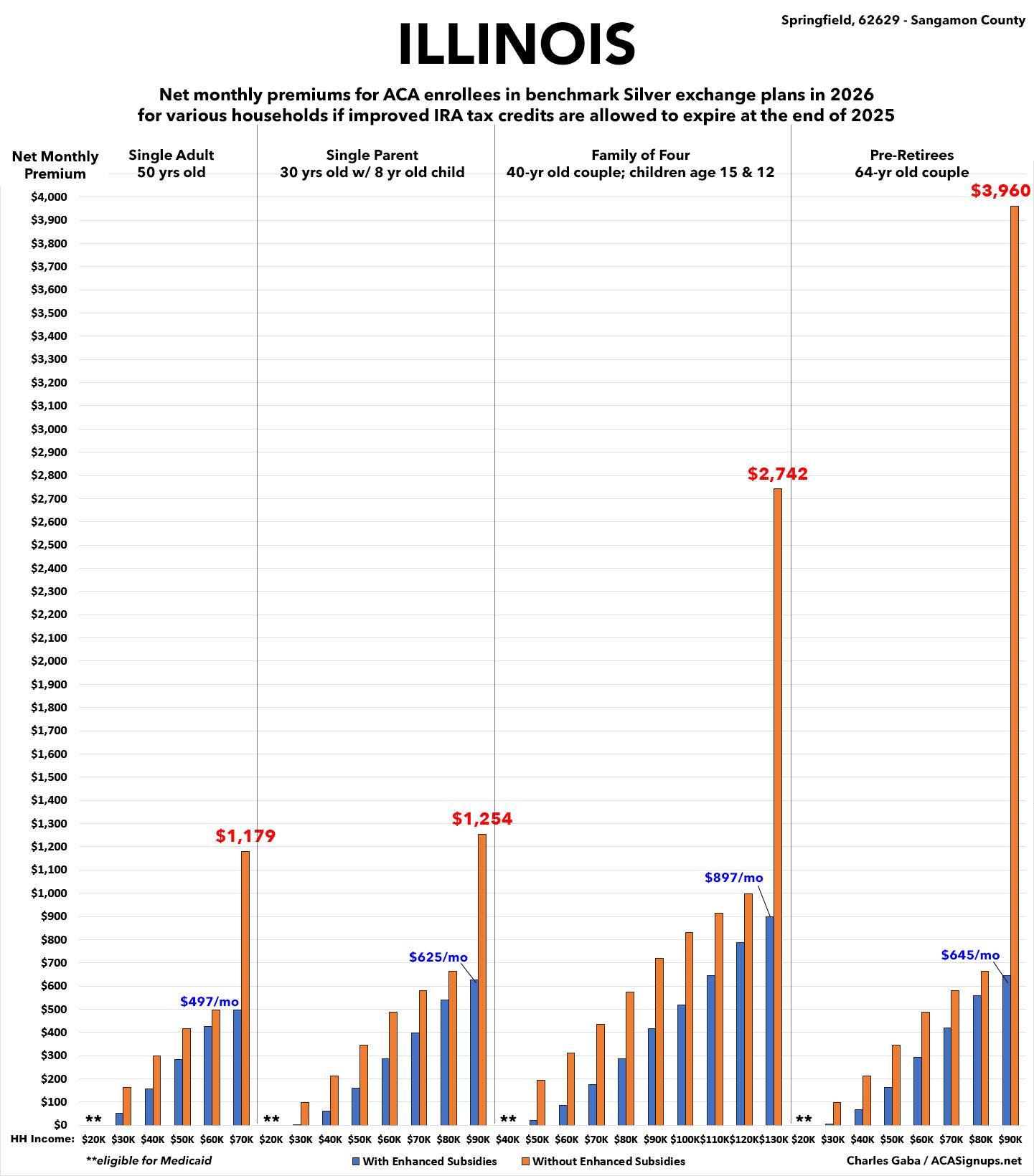 Illinois has around ~466,000 residents enrolled in ACA exchange plans, 90% of whom are currently subsidized. I estimate they also have another ~57,000 unsubsidized off-exchange enrollees.