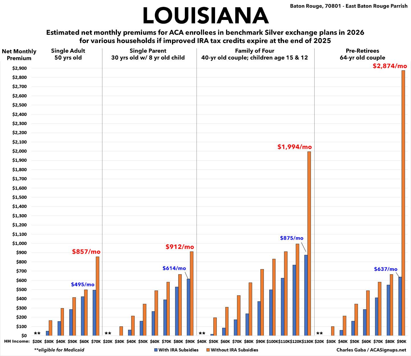 Louisiana has around ~293,000 residents enrolled in ACA exchange plans, 96% of whom are currently subsidized. I estimate they also have another ~13,000 unsubsidized off-exchange enrollees.