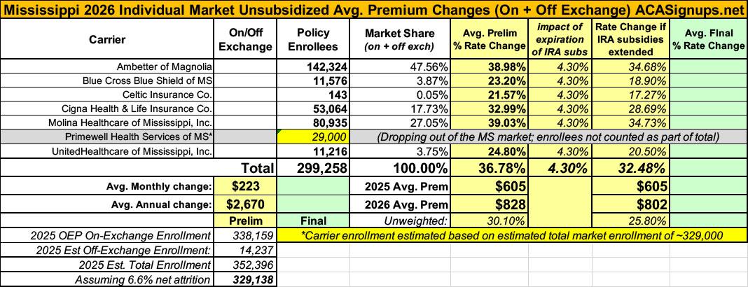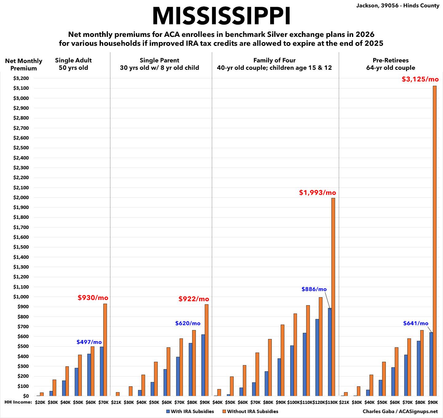 Mississippi has around ~338,000 residents enrolled in ACA exchange plans, 98% of whom are currently subsidized. I estimate they also have another ~14,000 unsubsidized off-exchange enrollees.