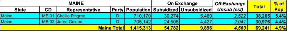Maine has around 64,000 residents enrolled in ACA exchange plans, 85% of whom are currently subsidized. I estimate they also have another ~4,500 unsubsidized off-exchange enrollees.