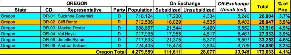 Oregon has around ~140,000 residents enrolled in ACA exchange plans, 80% of whom are currently subsidized. I estimate they also have another ~34,000 unsubsidized off-exchange enrollees.