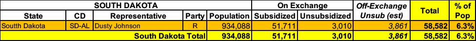 South Dakota has around ~54,000 residents enrolled in ACA exchange plans, 94% of whom are currently subsidized. I estimate they also have another ~3,000 unsubsidized off-exchange enrollees.