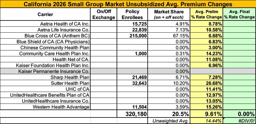 Meanwhile, I have no enrollment data at all for the small group carriers; the unweighted average 2026 rate hike there is around 14.4%