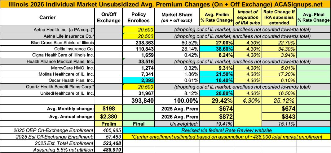UPDATE 9/8/25: The Illinois Dept. of Insurance has issued their final/approved decisions on the 2026 rate filings, and the net result is a slight decrease in the weighted average to 28.8% (even though my own math has it coming in ever so slightly higher).