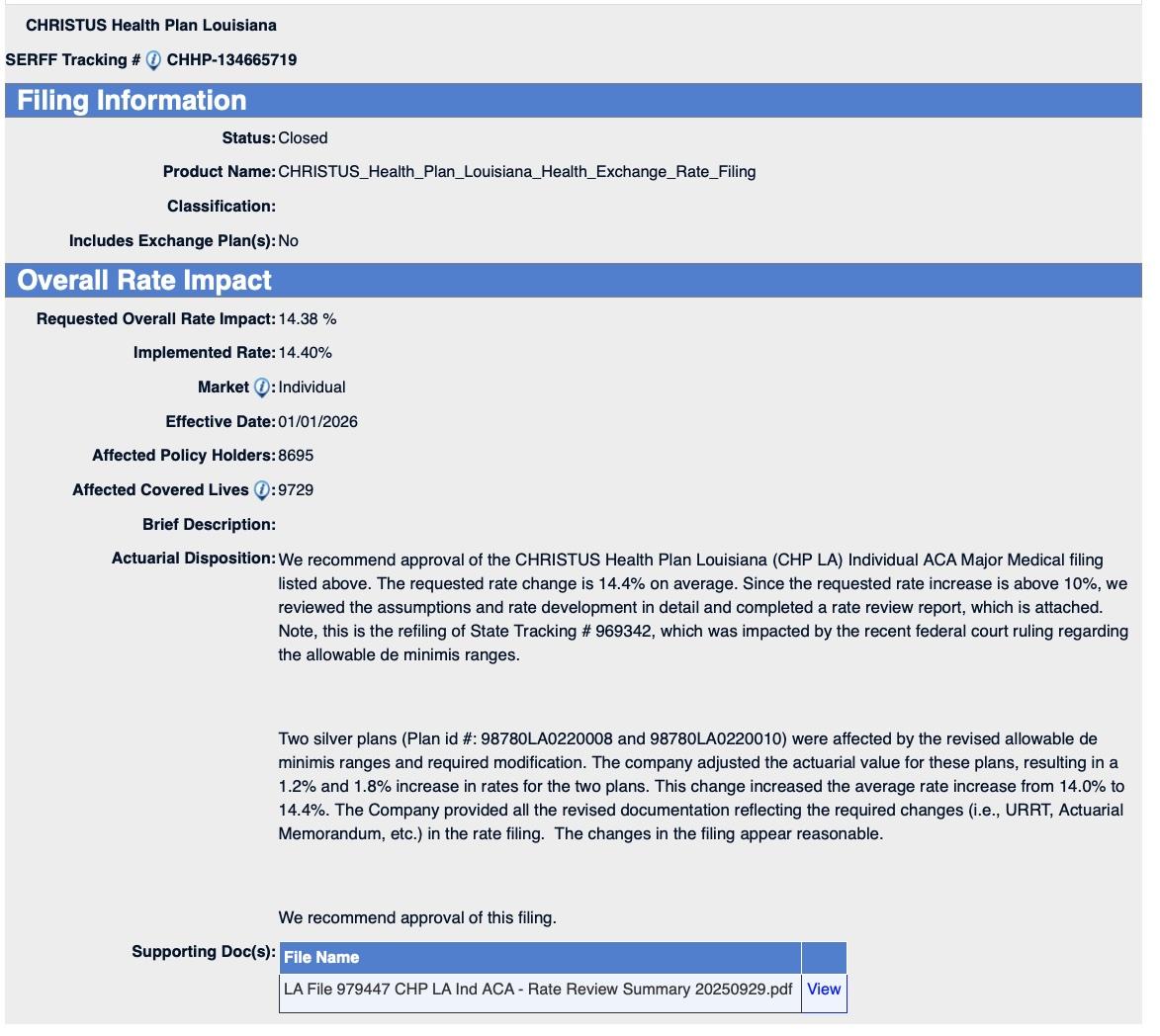 UPDATE 10/20/25: Thanks to Louise Norris for giving me the heads up that CHRISTUS isn't dropping out of the Louisiana ACA market after all; here's their final listing: