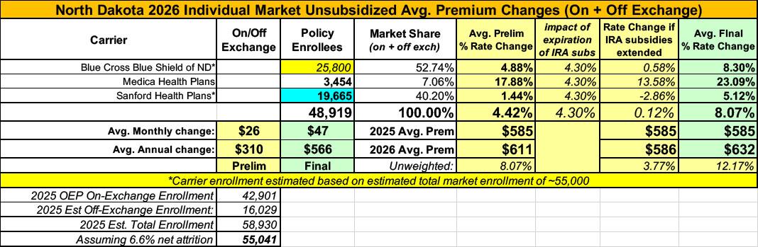 ND had around 43,000 on-exchange enrollments during the 2025 OEP. Using 2024 CMS liability risk score data I estimate total 2025 individual market enrollment of around 55,000, of which 3,454 are enrolled via Medica...just ~6% of the total.