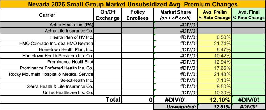 UPDATE 9/2/25: Nevada insurance carriers have posted their approved 2026 individual market filings, which also fill in some of the data gaps I had.