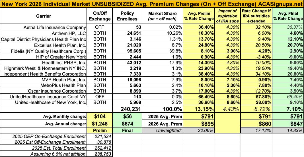 If so, this means that the average rate increases being requested by NY carriers would only be 8.6% for 2026 if the IRA subsidies were to be extended as opposed to the 13.2% they're actually asking for with the subsidies expiring (NY DFS actually puts it at 13.5% for some reason).