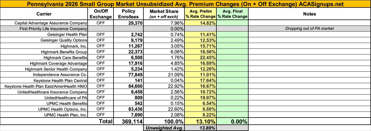 Insurers in Pennsylvania's small group market have filed 2026 plans requesting an average statewide increase of 13%.