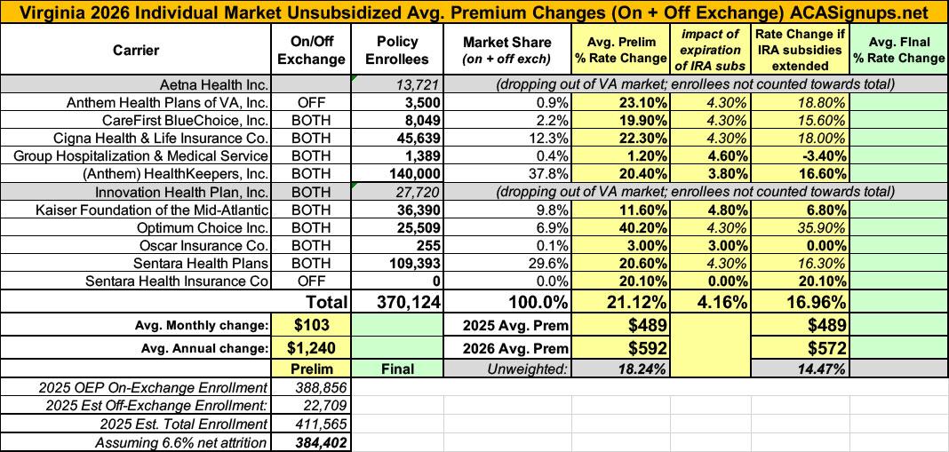UPDATE 9/23/25: 8 of the 10 carriers participating in Virginia's individual market have published what appear to be their final, approved 2026 rate filings, and the other two only have 4,500 enrollees between them (just 1.2% of the total market), so I'm going ahead and calling it.