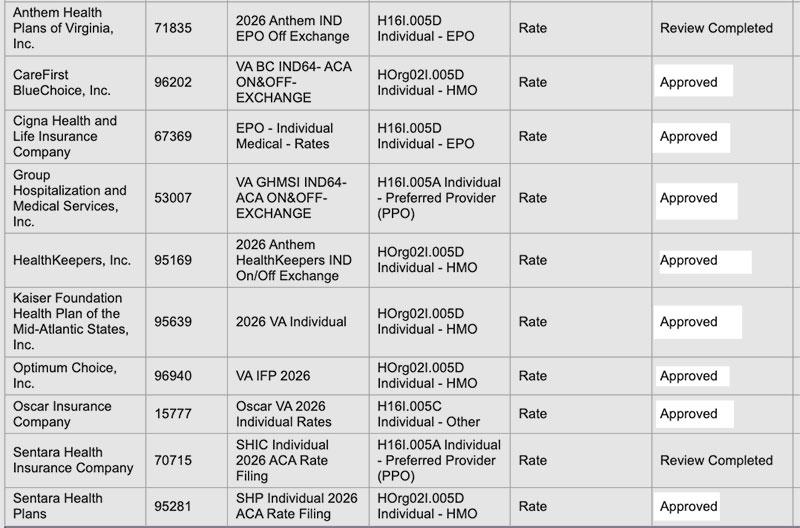 Overall preliminary rate changes via the SERFF database, Virginia Bureau of Insurance and/or the federal Rate Review database.