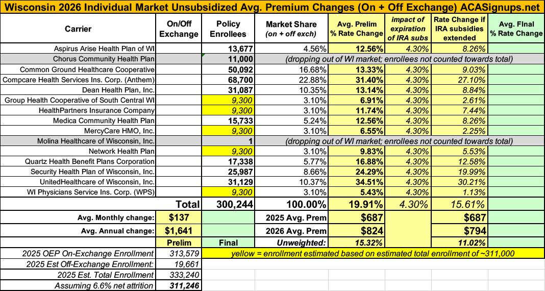 2026 Gross Rate Changes - Wisconsin: +19.9%; ~311,000 enrollees likely facing MASSIVE rate hikes in January