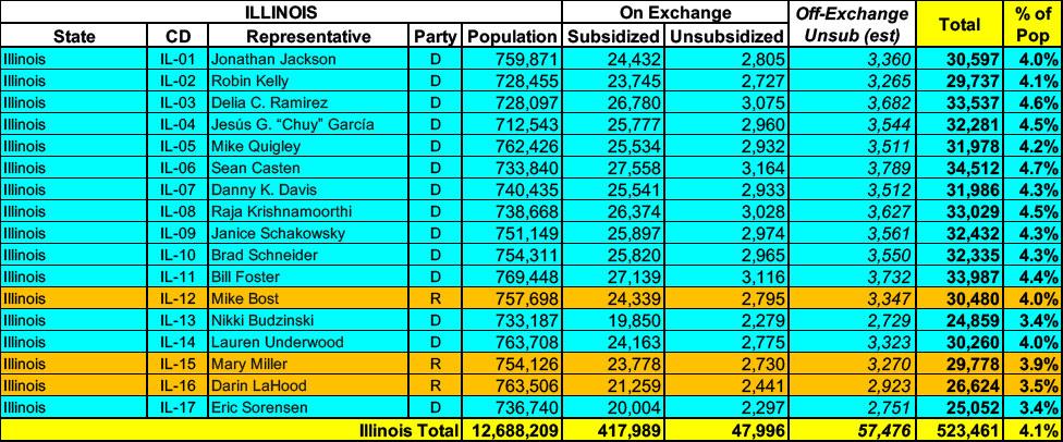 Illinois has around ~466,000 residents enrolled in ACA exchange plans, 90% of whom are currently subsidized. I estimate they also have another ~57,000 unsubsidized off-exchange enrollees.
